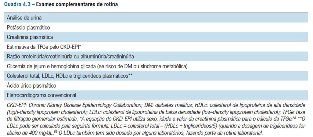 É necessário solicitar exames laboratoriais no momento diagnóstico e também anualmente – caso o paciente esteja compensado com os anti-hipertensivos: