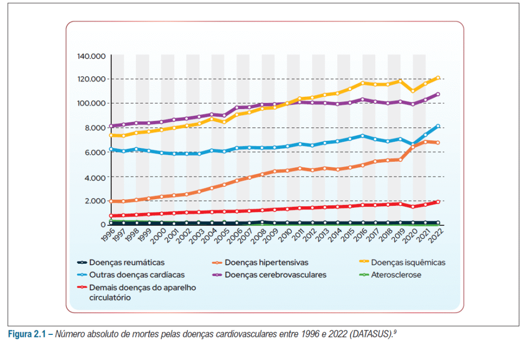 A figura inicial da diretriz ressalta que ainda estamos do maior problema na medicina – as doenças cardiovasculares são a causa principal de morte em todo o mundo e no Brasil, e esse número tende a aumentar nas próximas décadas.